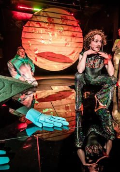 Zdjęcie trzech aktorów na scenie wśród elementów scenicznych dekoracji.