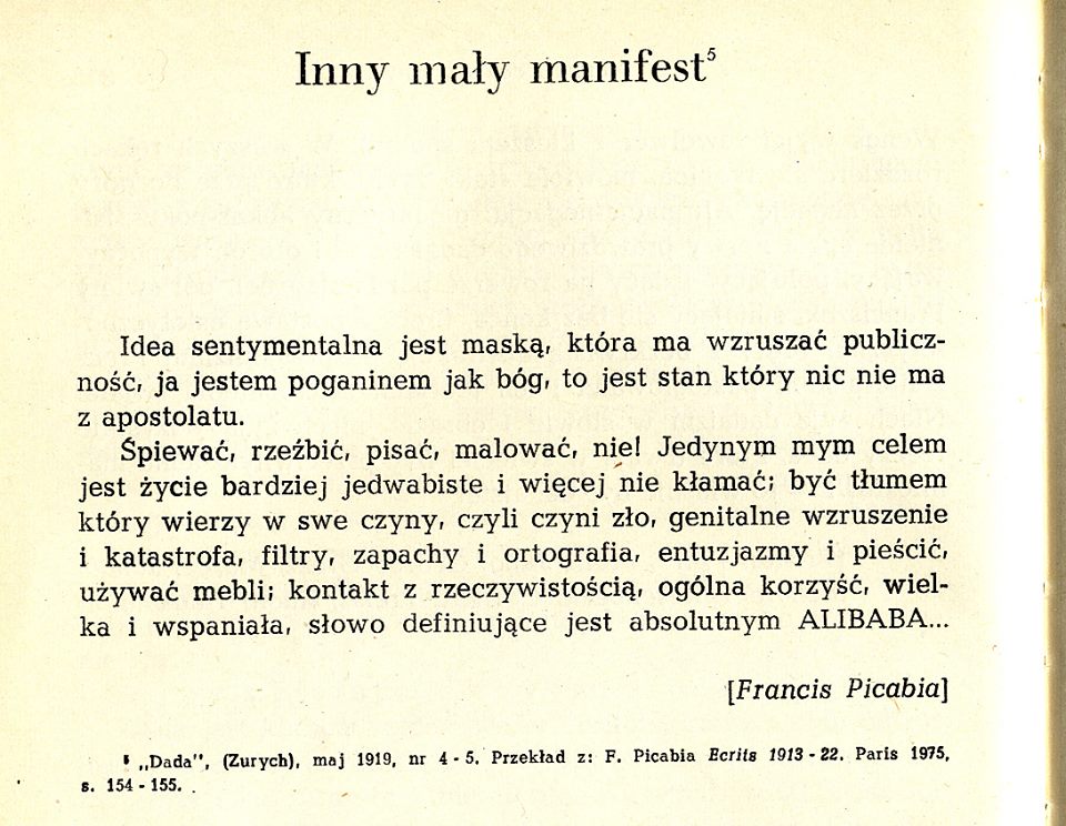 "Dada" (Zurych), maj 1919, nr 4-5. Przekład z: F. Picabia Ecrits, 1913-22. Paris 1975, s. 154-155.