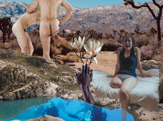 Obraz promujący wystawę to kolaż autorstwa Magdaleny Sobolskiej. Utrzymany jest w brązowo-niebieskich odcieniach. Na pierwszym planie znajduje się oczko wodne, w nim zanurzone są nurkinie. Z wody wyłania się czarna dłoń ze złotymi opuszkami palców, z których wyrasta lilia. Pobierz baner (PNG, 478,67 kB)