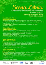 Tegoroczne koncerty Sceny Letniej w Akademii Muzycznej mają szczególnie uroczysty, jubileuszowy charakter. W roku 1993 władze uczelni, na czele z rektorem prof. Mieczysławem Koczorowskim oraz Fundacją Akademii, podjęły decyzję o organizowaniu w miesiącach letnich spotkań z muzyką, co spotkało się z aprobatą i wsparciem finansowym ze strony Władz Miasta Poznania. Od tego czasu, nieprzerwanie, w lipcu lub w lipcu i sierpniu - w każdą środę o godz. 17.00 - Poznań rozbrzmiewa muzyką w wykonaniu studentów, pedagogów i absolwentów Akademii Muzycznej im. I.J. Paderewskiego, wzbogacając ofertę artystyczną podczas "sezonu ogórkowego". Nasze koncerty cieszą się znakomitą frekwencją i są bardzo życzliwie przyjmowane przez poznańskich melomanów, a młodzi artyści swoje występy traktują jako wielki zaszczyt i wyróżnienie, podkreślając szczególną, niezwykle przyjazną atmosferę towarzyszącą muzyce.
