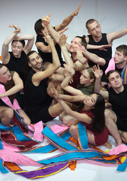 Zdjęcie grupy tancerzy siedzących na podłodze, z uniesionymi rękoma; niektórych z nich oplatają kolorowe szarfy.