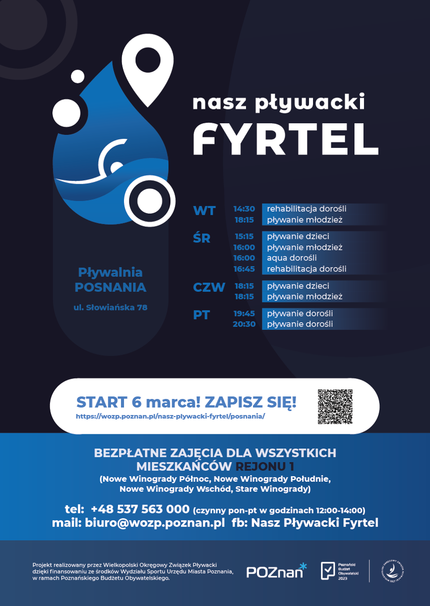 Projekt realizowany jest przez Wielkopolski Okręgowy Związek Pływacki, a finansowany ze środków Wydziału Sportu Urzędu Miasta Poznania w ramach Poznańskiego Budżetu Obywatelskiego 2023