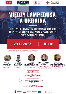 Plakat informacyjny dotyczący konferencji o tytule Między Lampedusą a Ukrainą.