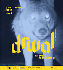 Grafika bazująca na nieostrej, prześwietlonej fotografii wilka. Zdjęcie w niebieskich barwach. Na nie nałożone żółte napisy: "6.09-30.11.2025, DRWAL, HISTORIE O MĘSKOŚCI, KURATOR: PRZEMYSŁAW JĘDROWSKI". Pobierz baner (JPEG, 9,99 kB)