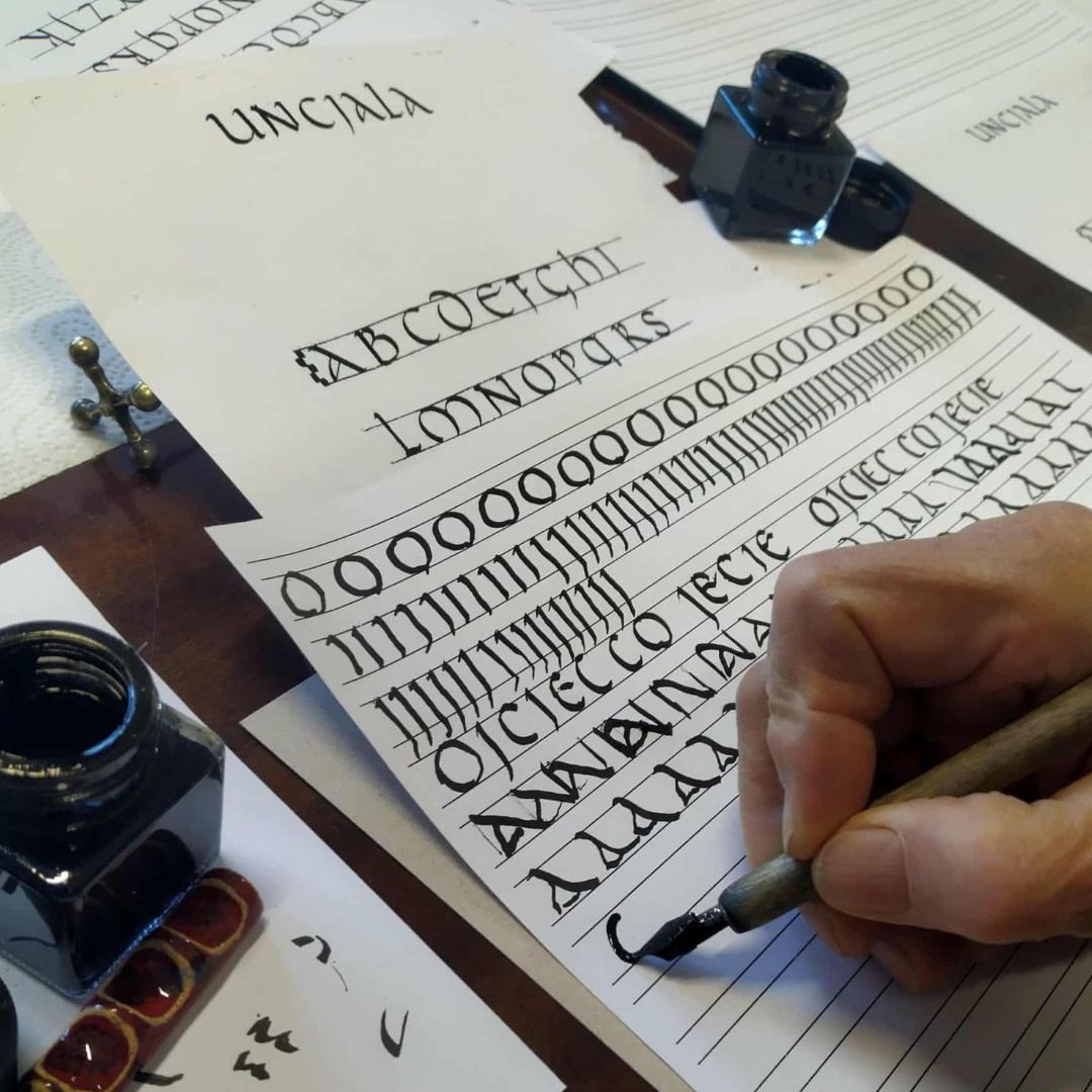 Uczestnicy zapoznają się z podstawami pisma uncjalnego - najstarszego pisma średniowiecznego, idealnego na pierwszy kontakt z kaligrafią.