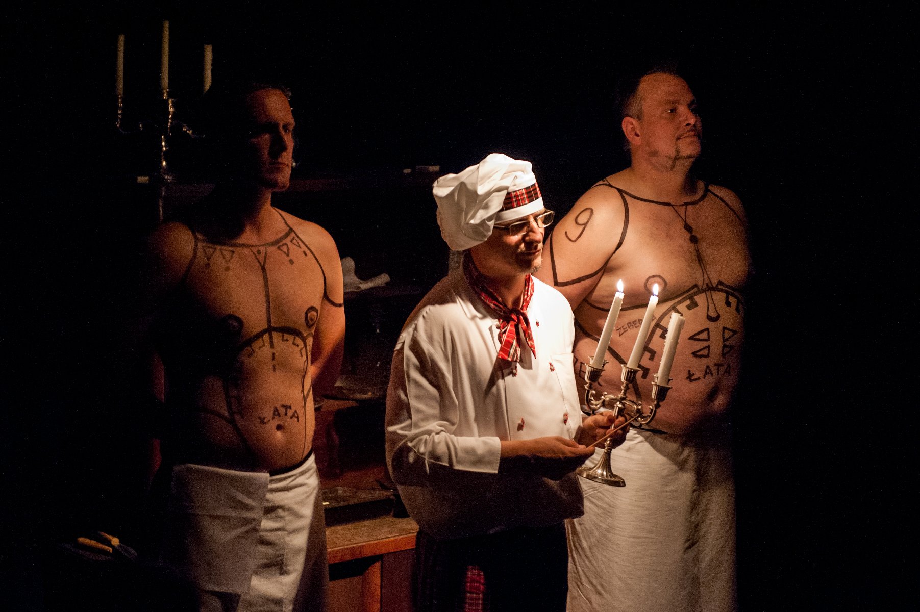 Na zdjęciu trzech mężczyzn: jeden, w środku, ubrany w biały uniform z biała kucharską czapką na głowie, trzyma w ręce świecznik, dwóch pozostałych z nagimi wytatułowanymi torsami za nim.