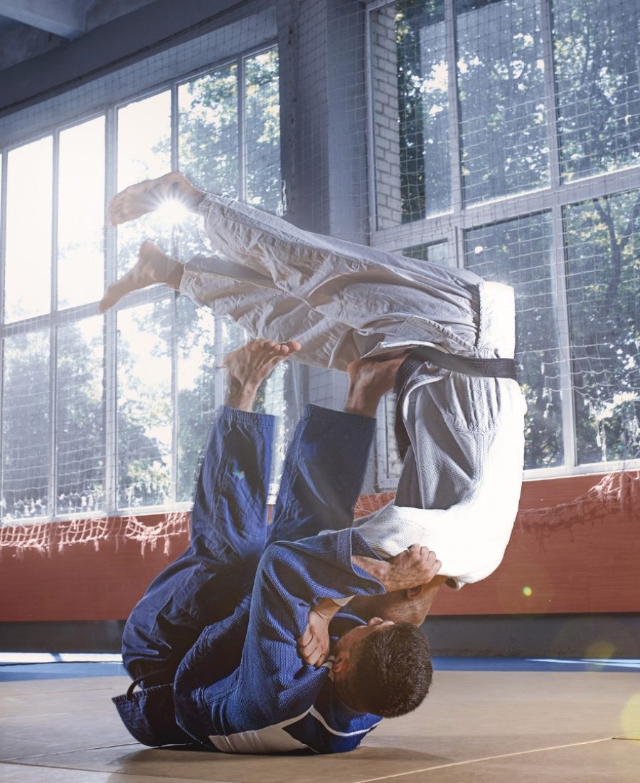 Dwóch zawodników ubranych w białą i niebieską judogę ćwiczy judo. Pobierz baner (JPEG, 169,85 kB)