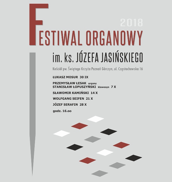 Kolejna edycja Festiwalu Organowego im. ks. Józefa Jasińskiego w kościele Świętego Krzyża. Festiwal został zapoczątkowany w 2013 roku, po ukończeniu remontu imponującej wielkości czteromanuałowych organów. W ramach tegorocznej edycji po raz kolejny odbędzie się 5 koncertów połączonych z wykładami. Jeden z nich będzie upamiętnieniem postaci budowniczego górczyńskich organów - Bronisława Cepki - którego 15. rocznica śmierci przypada w 2018 roku. Koncert "Bronisław Cepka in memoriam" 14 października wykona profesor poznańskiej Akademii Muzycznej Sławomir Kamiński, a w wykładzie poświęconym postaci zasłużonego wielkopolskiego organmistrza przybliży jego działalność. Podczas festiwalu będziemy mieli okazję również usłyszeć jednego z najbardziej utytułowanych polskich organistów, profesora Józefa Serafina z Krakowa, dyrektora artystycznego Festiwalu Organowego w Kamieniu Pomorskim, który po koncercie opowie o dziejach tamtejszych organów - jednego z najcenniejszych zabytków budownictwa organowego w Polsce. Niewątpliwą gratką dla miłośników muzyki organowej będzie koncert gościa specjalnego - prof. Wolfganga Seifena z Universität der Künste w Berlinie, jednego z najbardziej uznanych improwizatorów na świecie.