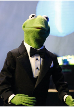 Pacynka żaba w smokingu dyryguje. Pobierz baner (JPEG, 50,23 kB)