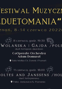 Duetomania to wydarzenie, którego z pewnością brakowało na polskiej scenie muzycznej. Ideą festiwalu jest rozpowszechnienie i przybliżenie kameralistyki, ukazanie różnorodnej muzyki klasycznej w formie atrakcyjnej dla koneserów, jak również przystępnej dla osób na co dzień mających utrudniony dostęp do dóbr kultury wysokiej. Festiwal Muzyczny "Duetomania" to prezentacja najwyższej jakości muzyki duetowej.