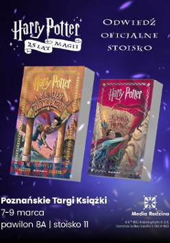 Z okazji 25-lecia Harry'ego Pottera w Polsce na stoisku 11 w pawilonie 8A, podczas Poznańskich Targów Książki, wydawnictwo Media Rodzina przygotowało oficjalną strefę Harry'ego Pottera! Znajdziesz tam nie tylko klasyczne siedem tomów w różnych edycjach, w tym przedpremierowo "Harry Potter i Kamień Filozoficzny" w jubileuszowej okładce Mary GrandPré, podręczniki hogwarckie i tytuły okołopotterowe, ale także sprawdzisz swoją wiedzę w potterowym quizie, zrobisz pamiątkowe zdjęcie w magicznym lustrze i porozmawiasz z Danielem - prawdziwym ekspertem, który wie o Hogwarcie więcej niż sam Dumbledore! Dodatkowo na całą ofertę obowiązywać będzie rabat -30%!