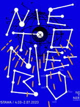 Biało-żółte kreski i figury geometryczne na niebieskim tle.