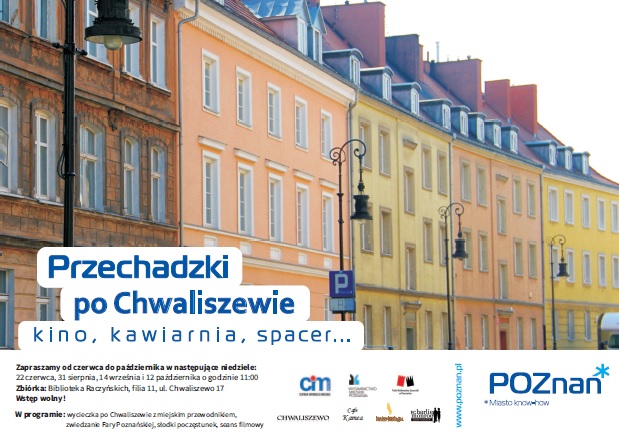 Miasto Poznań przy współpracy ze stowarzyszeniem Chwaliszewo zaprasza na kolejna edycję "Przechadzek - kino, kawiarnia i spacer..., pod okiem profesjonalnych przewodników miejskich organizowanych w ramach realizacji Miejskiego Programu Rewitalizacji dla miasta Poznania.