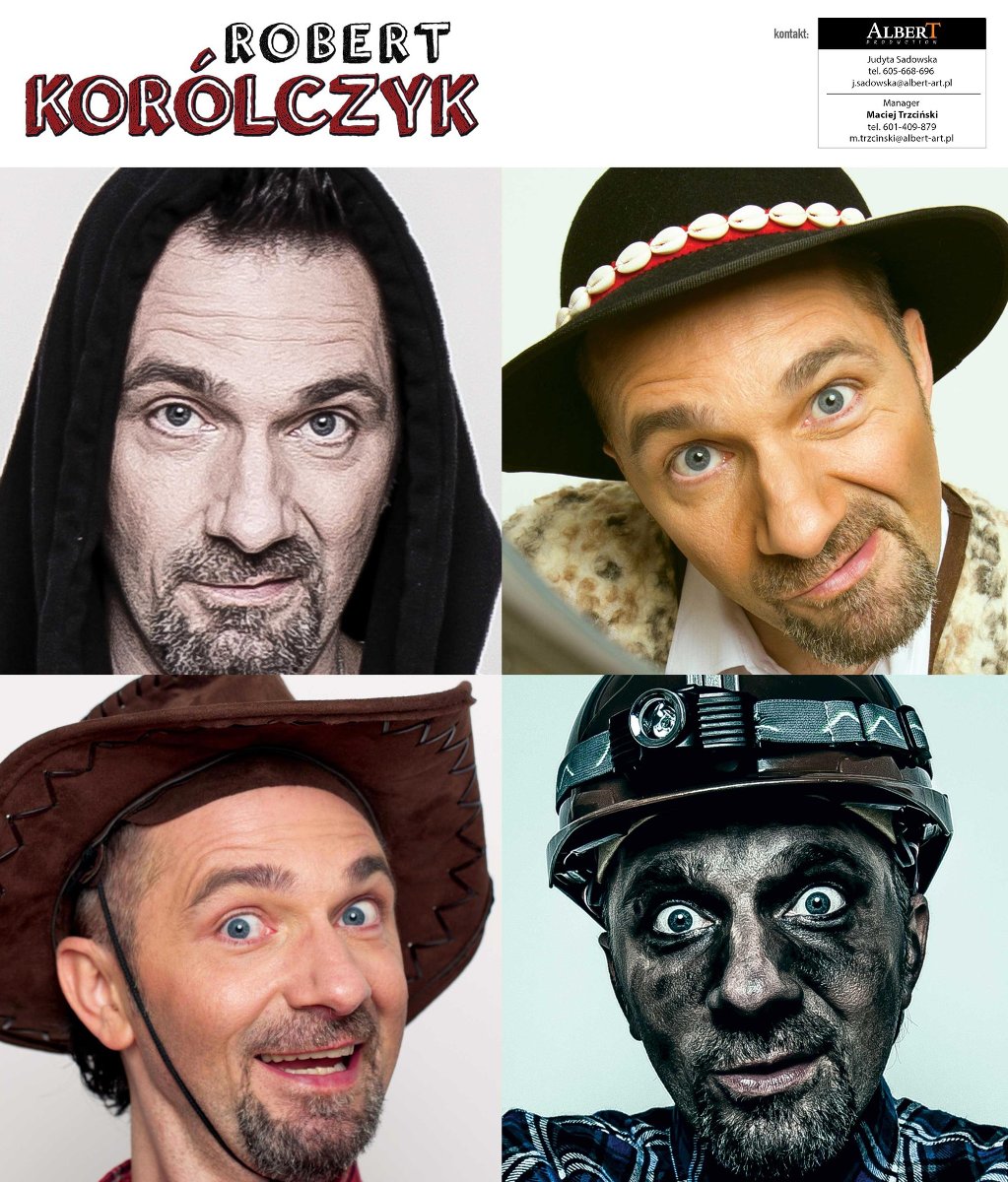 ROBERT KORÓLCZYK - lider Kabaretu Młodych Panów, twórca tekstów kabaretowych od lat bawiący miliony Polaków jako "Góral", "Górnik Andrzej" i wiele innych postaci. Jego monologi z dużą dawką ironii i dystansu do otaczającej rzeczywistości podbiły serca widzów! Potrafi naśladować i parodiować. Sprawnie naśladuje gwary, choć prawdziwie zna tylko gwarę śląską. Mówi w każdym języku, choć zna tylko jeden. Jego głos jest na tyle charakterystyczny, iż publiczność często poznaje go nie tylko po twarzy, ale właśnie po glosie. W trakcie występu przeistacza się z postaci w postać, pokazując tym samym swój fantastyczny repertuar różnych charakterów.