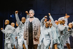 Zdjęcie z przedstawienia: grupa aktorów w białych strojach w różnych pozach na scenie. Na pierwszym planie wyprostowany mężczyzna. Pobierz baner (JPEG, 61,62 kB)