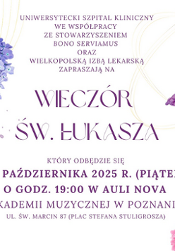 Dyrekcja Uniwersyteckiego Szpitala Klinicznego w Poznaniu, Stowarzyszenie Bono Serviamus oraz Wielkopolska Izba Lekarska zapraszają na Wieczór św. Łukasza, który odbędzie się 17 października 2025 r. o godz. 19:00 w Poznaniu (Aula Nova Akademii Muzycznej w Poznaniu). Jest to wieczór specjalny, który może poszczycić się już ponad 20-letnią tradycją, powstał jako wydarzenie kulturalne dedykowane pracownikom ochrony zdrowia, w podziękowaniu za ich codzienną, ofiarną pracę.