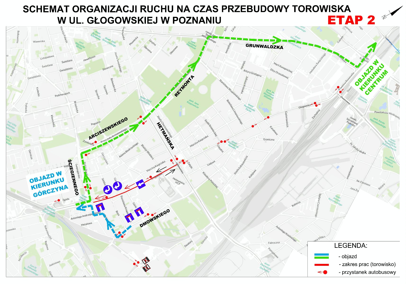 Objazd dla kierowców jadących z Górczyna w stronę centrum wytyczono ulicami Ściegiennego, Arciszewskiego, Reymonta i Grunwaldzką. Natomiast kierowcy jadący w stronę Górczyna z uwagi na utrudnienia proszeni są o korzystanie w miarę możliwości - z trasy alternatywnej, np. ulicami Dmowskiego, Daleką i Andrzejewskiego. W załączeniu - schemat organizacji ruchu na czas II etapu prac na ul. Głogowskiej.