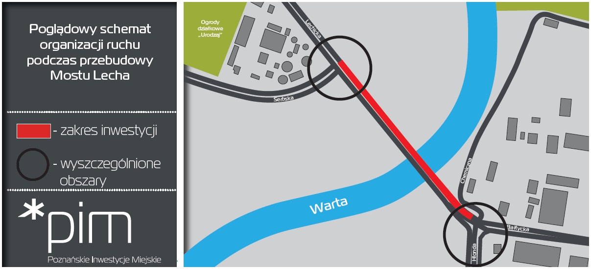 Tymczasowa organizacja ruchu na czas budowy nowego mostu zostanie wprowadzona w nocy z 3 na 4 sierpnia. Potem nastąpi całkowite wyłączenie z użytkowania północnej nitki mostu Lecha, której rozbiórka rozpocznie się w sobotę 4 sierpnia. Będący w bardzo złym stanie technicznym północny most zostanie całkowicie rozebrany i wybudowany od nowa.