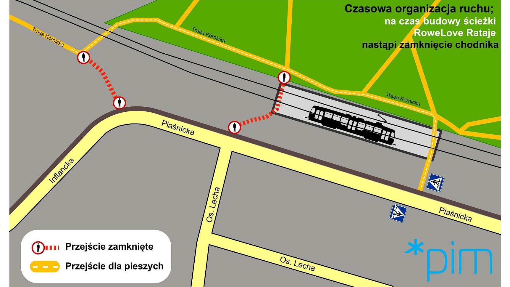 Dla bezpieczeństwa przechodniów, na czas prowadzenia robót (29 lutego - 4 marca) związanych z budową kolejnego etapu ("I-J"), zostanie wprowadzona czasowa organizacja ruchu. Zamknięty zostanie chodnik od ul. Inflanckiej prowadzący do trasy tramwajowej oraz chodnik od ul. Piaśnickiej do trasy tramwajowej. Piesi w tym rejonie będą mogli poruszać się wyznaczonymi przejściami wzdłuż trasy przez sąsiadujący park.