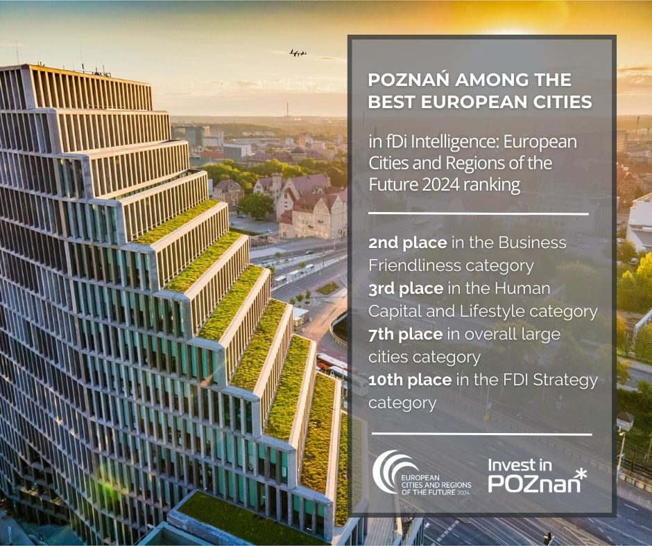 - European Cities and Regions of the Future 2023/2024 For another year in a row, the City of Poznań has conquered the podium in the annual fDi Intelligence survey. According to the report "European Cities and Regions of the Future 2023', the capital of Wielkopolska is the second most business-friendly city! In the overall ranking, it took 7th place among locations such as Hamburg, Rotterdam and Manchester. This year, Poznań qualified in the category of large cities.
