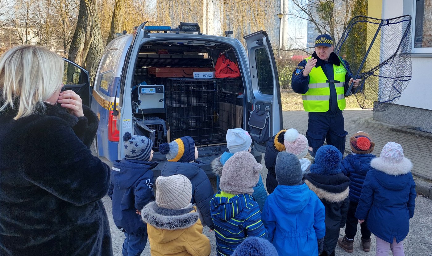 Przedszkolacy mieli okazję dowiedzieć się co to jest segregacja odpadów wytworzonych w naszych domach i jaki jest jej cel. Do jakiego pojemnika wrzucać papier, tworzywa sztuczne, szkło, czy też odpady zmieszane. Odpowiedziano również na pytania dzieci dotyczące recyklingu i zagadnień ekologicznych. Omówiono również zasady bezpiecznego kontaktu z obcym psem, a także postawy obronne, które należy przyjąć w przypadku jego ataku. Dodatkową atrakcją podczas spotkania był radiowóz EkoPatrolu Straży Miejskiej, którego załoga realizuje zadania w zakresie ekologii, ochrony zwierząt i środowiska. Przedszkolacy dowiedzieli się o działaniach strażników na rzecz zwierząt dziko żyjących, a także domowych, które znalazły się w sytuacji zagrożenia - jak takie zwierzęta się przewozi, gdzie trafiają bezdomne pieski i koty, a także chore, czy ranne zwierzęta, np. ptaki.