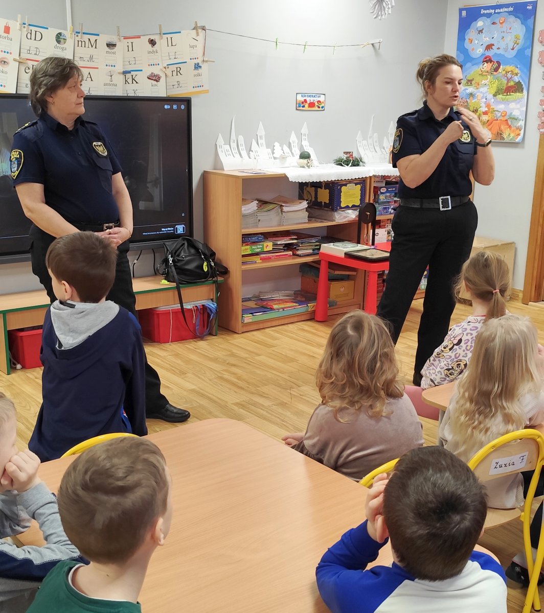 Strażniczki z Zespołu Profilaktyki podczas spotkań z uczniami przypominały o bezpiecznych zachowaniach, niezależnie od miejsca i sposobu spędzania wolnego od szkolnych obowiązków czasu. Przypomniały o koniecznej rozwadze i ostrożności, o odpowiedzialnym zachowaniu - większość czasu będą spędzać bez bezpośredniej opieki osób dorosłych. Rozmawiano o zasadach bezpieczeństwa podczas zabaw i zimowej aktywności, ale także podczas domowych lub na półkolonii zajęć z rówieśnikami, albo w miejskich przestrzeniach publicznych, również podczas korzystania z miejskiej komunikacji. Ważnym elementem osobistego bezpieczeństwa jest zachowanie ostrożności i niepodejmowanie niepożądanego kontaktu z inicjatywy nieznanych osób.