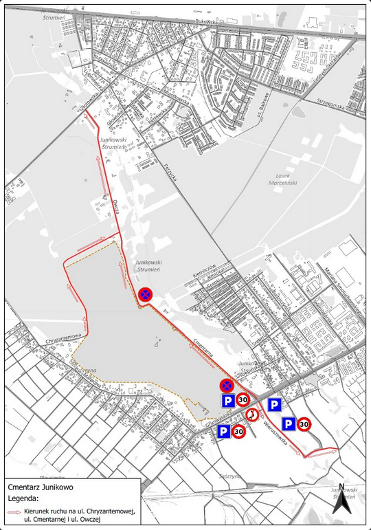 Na Junikowie ul. Chryzantemowa będzie od 25 października do 2 listopada jednokierunkowa od ul. Malwowej do ul. Owczej (z zachowaniem dwóch kierunków ruchu na początkowym odcinku od ul. Malwowej). 31 października i 1 listopada ul. Cmentarna i Owcza będą całą dobę jednokierunkowe od ul. Grunwaldzkiej do ul. Złotowskiej, 1 listopada ul. Złotowska będzie jednokierunkowa od ul. Owczej do Bukowskiej, a ul. Wieruszowska jednokierunkowa od ul. Grunwaldzkiej do Junikowskiej. Na wniosek policji jeden kierunek na ul. Cmentarnej i Owczej może być wprowadzany także w inne dni.