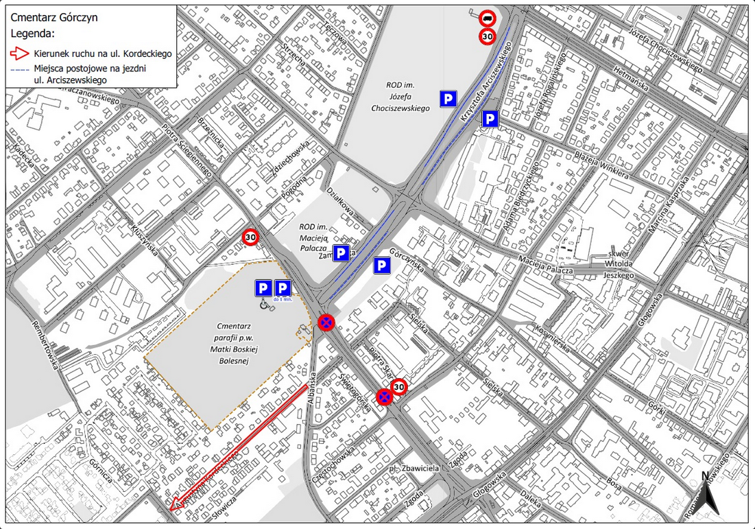 Przy cmentarzu Górczyńskim na ul. Arciszewskiego od 25 października do 2 listopada obowiązywać będzie zakaz ruchu pojazdów ciężarowych od ul. Hetmańskiej do ul. Ściegiennego. Przez cały ten czas nie będzie możliwe parkowanie w pasie rozdziału, a w celu umożliwienia pozostawienia samochodów na lewym pasie ruch pojazdów na tym odcinku odbywać się będzie w obie strony jednym (prawym) pasem. W dniach 25-26 października oraz 2 listopada parkowanie na lewym pasie ul. Arciszewskiego będzie możliwe na odcinku od ul. Palacza do ul. Ściegiennego, a w dniach szczególnie nasilonego ruchu, 31 października i 1 listopada - na dłuższym odcinku od ul. Hetmańskiej do ul. Ściegiennego.