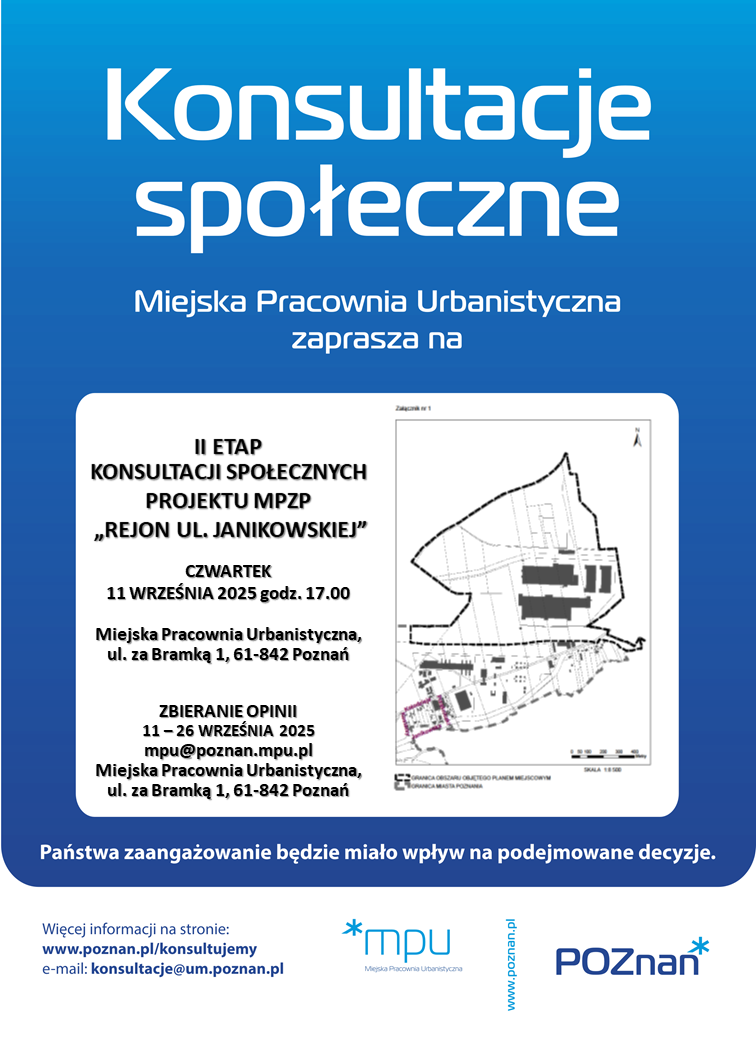 - Zarządzenie nr 626/2025/P w sprawie przeprowadzenia II etapu konsultacji społecznych dotyczących projektu miejscowego planu zagospodarowania przestrzennego "Rejon ulicy Janikowskiej" w Poznaniu.