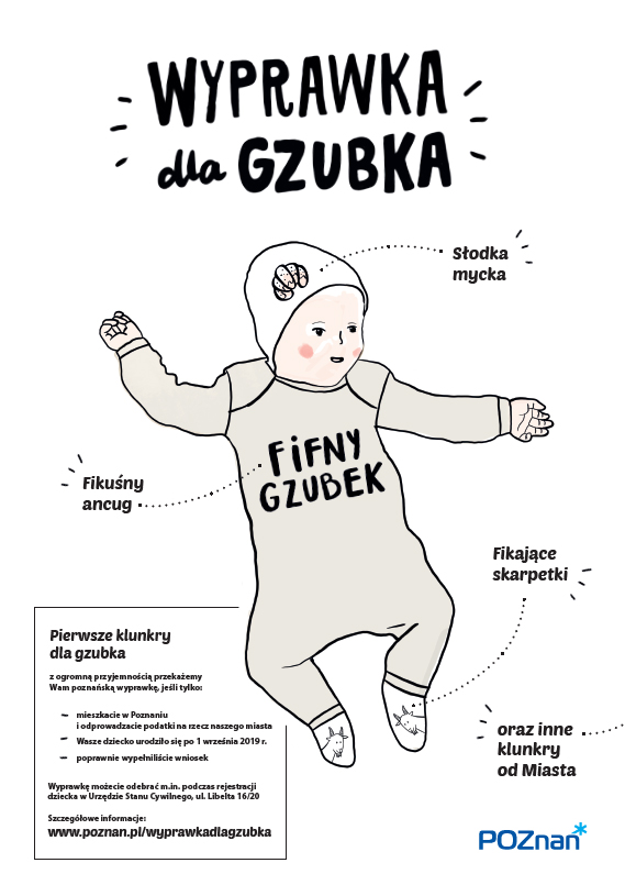 Noworodki urodzone w Poznaniu, których rodzice mieszkają na terenie Poznania i tutaj rozliczają podatki, na wniosek mogą otrzymać "wyprawkę dla gzubka" z motywami graficznymi nawiazującymi do lokalnych tradycji. Szczególy na stronie: www.poznan.pl/wyprawkadlagzubka