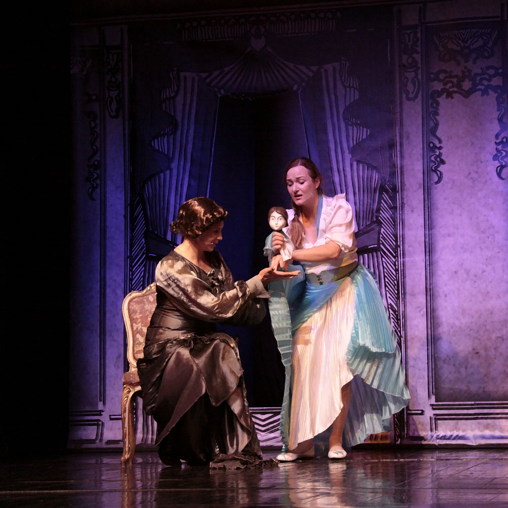 Zdjęcie ze spektaklu - dwie kobiety na scenie, jedna siedzi na krześle, druga stoi i trzyma w rękach lalkę.