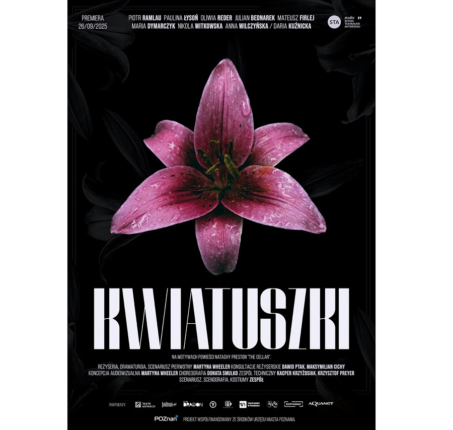 Na czarnym tle rozkwitający kwiat o różowych płatkach. W górnej i dolnej części plakatu informacje o spektaklu. Pobierz baner (JPEG, 151,39 kB)