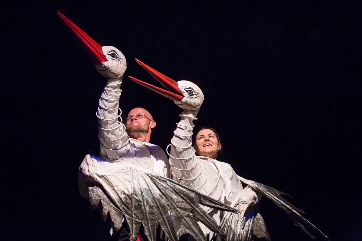 Zdjęcie ze spektaklu - dwóch aktorów w przebraniach białych bocianów.