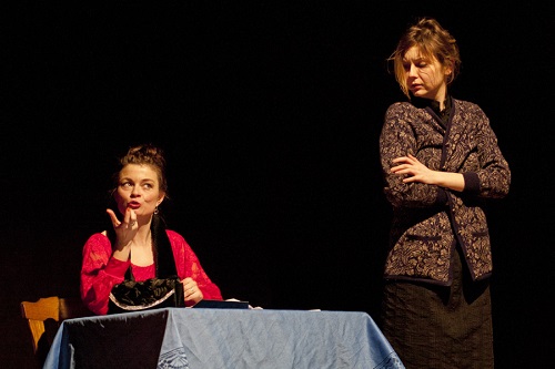 Dwie kobiety, jedna siedzi przy stole i gestykuluje, druga stojąc z założonymi rękoma patrzy w jej kierunku. Ciemne tło.