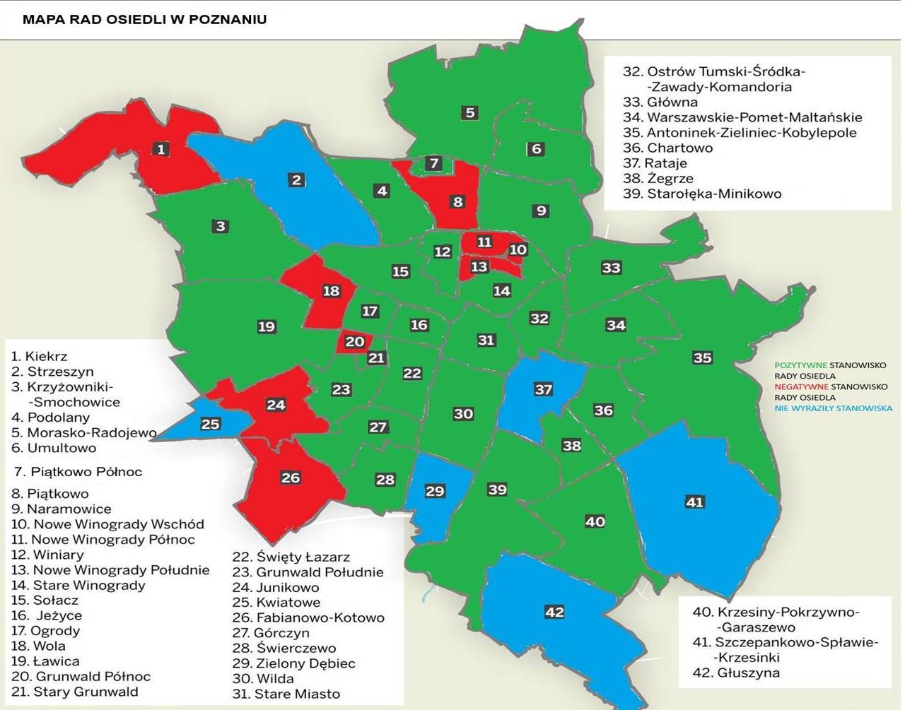 - Osiedla, które nie zajęły stanowiska: Głuszyna, Kwiatowe, Rataje, Strzeszyn, Szczepankowo-Spławie-Krzesinki, Zielony Dębiec.