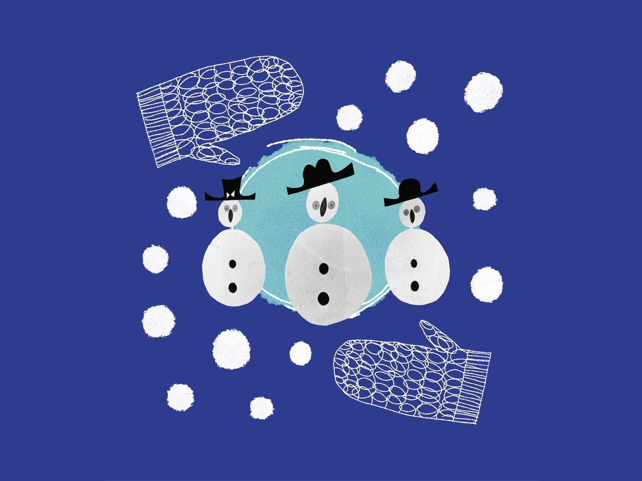 Grafika na granatowym tle przedstawiająca trzy postaci - bałwanki, umieszczone w centralnym, turkusowym okręgu. Wokół widoczne są białe kropki przypominające śnieg oraz ilustracje jednopalczastych rękawiczek.