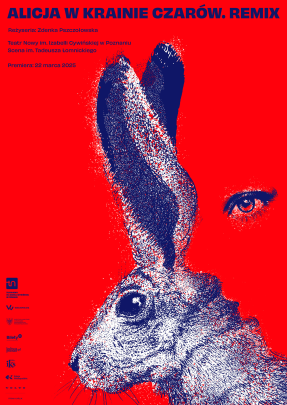 Rysunek królika w kolorze niebiesko-fioletowym. Czerwone tło, które częściowo jest zarysem profilu twarzy z jednym okiem. U góry i z lewej strony plakatu informacje o spektaklu.