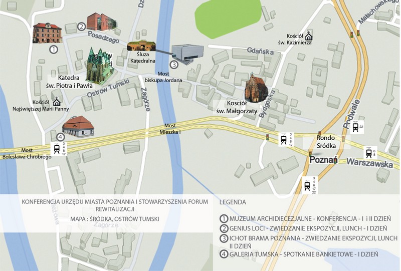 Atrakcje: Oprócz interesującego programu, organizatorzy starali się zapewnić uczestnikom konferencji pobyt w ciekawych wnętrzach urbanistycznych parku historycznego na Ostrowie Tumskim i Śródce oraz w historycznych i nowych wnętrzach architektonicznych: dawnej Akademii Lubrańskiego, obecnie Muzeum Archidiecezjalnym (2006); w Rezerwacie Archeologicznym Genius loci (2012); w dawnej Śluzie Tumskiej, obecnie Interaktywnym Centrum Historii Ostrowa Tumskiego Brama Poznania (2014) i dawnej kanonii, obecnie restauracji Galeria Tumska (2015). Wszyscy zgłoszeni uczestnicy konferencji otrzymają w prezencie książkę wydaną w ramach projektu edukacyjnego przeprowadzonego wspólnie przez SFR i M. Poznań - pt. "Wspólne nie znaczy niczyje, czyli o podwórkach i ulicach coś dla dziecka i rodzica (2014).