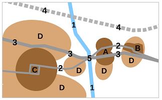 Uwarunkowania, jeśli podsumować najważniejsze z nich, nie sprzyjają łatwemu rozwiązaniu problemu. Z jednej strony, obowiązujące Studium uwarunkowań i kierunków zagospodarowania miasta nadal przewiduje poprowadzenie trasy międzydzielnicowej wg przebiegu planowanego od lat 30-tych XX w. (4) i w konsekwencji uspokojenie ruchu na obecnie funkcjonującej trasie (3). Z drugiej strony, trzeba liczyć się z tym, że budowa wspomnianej trasy (4) będzie bardzo kosztowna, określenie jej przyszłych efektów trudne do oszacowania, a w związku z tym podjęcie decyzji o rozpoczęciu budowy niełatwe i oddalone w czasie. To wszystko powoduje, że większe inwestycje poczynione w tym miejscu (5) mogą być mało racjonalne. Czy oznacza to, że problem będzie istniał dalej, w nieskończoność i nie pozostanie w żaden sposób rozwiązany? Sytuację przestrzenną tego przypadku przedstawia zamieszczona obok ilustracja.