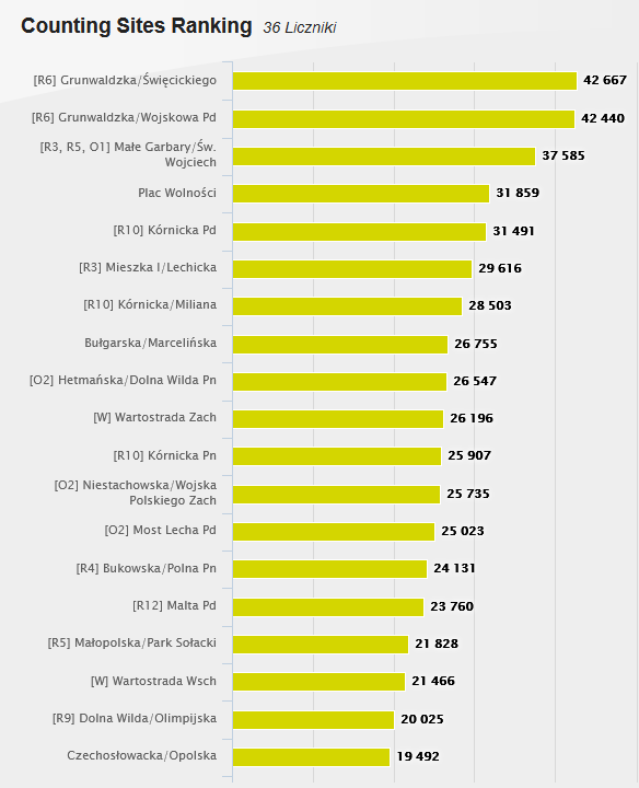 Najwięcej rowerzystów liczniki odnotowały na trasie przy ul. Grunwaldzkiej, przy skrzyżowaniu z ulicą Święcickiego oraz z ulicą Wojskową. Na podium znalazła się także trasa wzdłuż ulicy Solnej - licznik zlokalizowany przy skrzyżowaniu ulic św. Wojciecha i Małych Garbar zarejestrował aż 37 585 przejazdów w październiku. Sporym wzrostem zainteresowania cieszy się także trasa wzdłuż tramwaju na Naramowicach. Z licznika można odczytać, że przejechało tędy ponad 3000 osób więcej nić rok temu o tej porze.