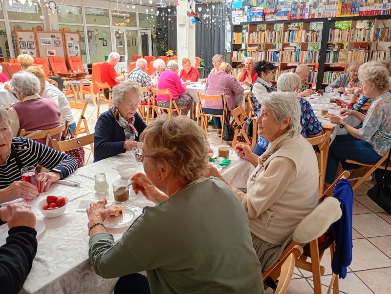 - Regularne i spontaniczne spotkania w ogródku, w którym bez względu na aurę - no chyba że pada... - siedzimy, pijemy kawę, jemy śniadania lub podwieczorki. Często gramy tam w gry pamięciowe lub boccię, opowiadamy sobie najświeższe nowinki, trochę dziabiemy i hakamy, podziwiamy nasze kwiatki i obserwujemy ptaki i wiewiórki.