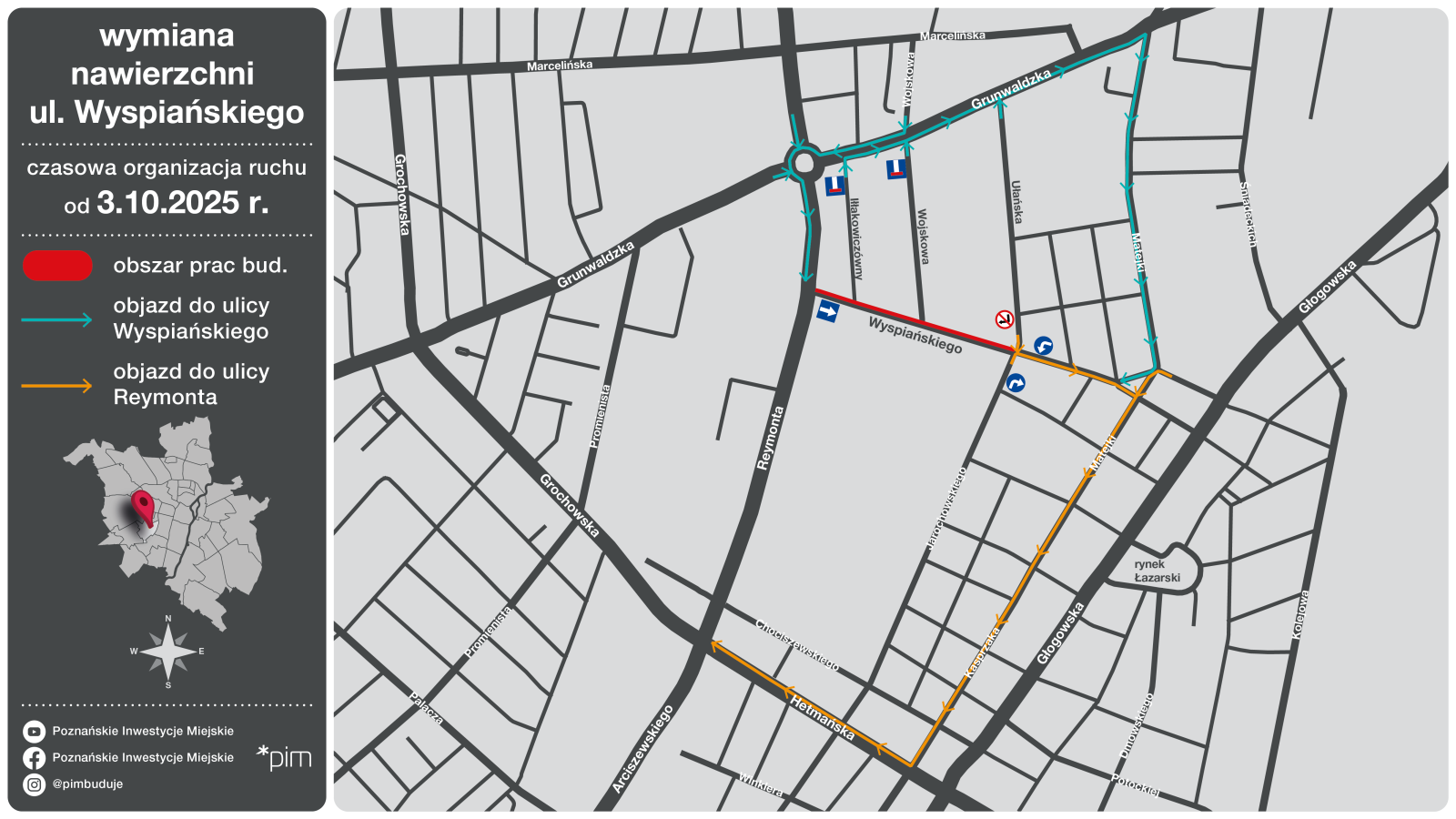 W obu etapach prac zakłada się wyłączenie sygnalizacji świetlnej na skrzyżowaniu ulic Wyspiańskiego i Jarochowskiego. Objazd do ul. Reymonta możliwy będzie ulicami Matejki, Kasprzaka i Hetmańską.