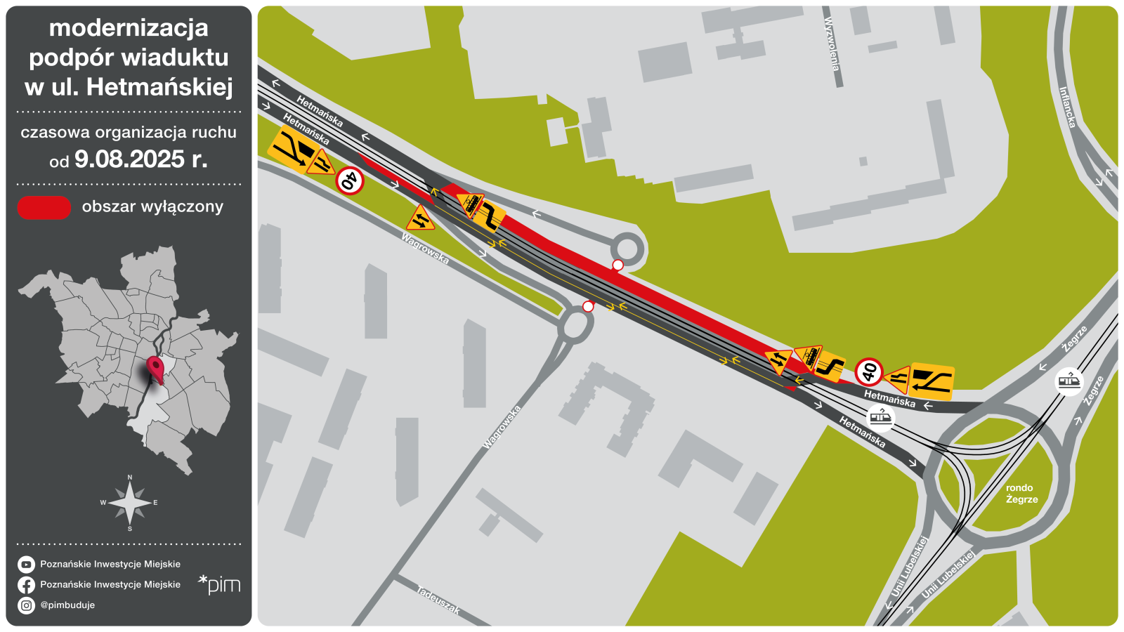 W związku z nadchodzącymi pracami, od 9 sierpnia obowiązywać będzie zmieniona organizacja ruchu na wiadukcie. Będzie taka, jak w pierwszym etapie robót. Przejazd w obu kierunkach między rondami Starołęka i Żegrze zostanie przeniesiony na jezdnię południową. Tak jak obecnie, kierowcy poruszający się ul. Hetmańską dostaną się na drugą jezdnię przewiązkami, czyli tymczasowymi przejazdami przez torowisko tramwajowe, znajdującymi się po obu stronach wiaduktu. W dalszym ciągu należy zachować szczególną ostrożność przy pokonywaniu torowiska i bezwzględnie ustępować tramwajom. Ze względów bezpieczeństwa w rejonie prac nadal będzie obowiązywało ograniczenie prędkości do 40 km na godz.