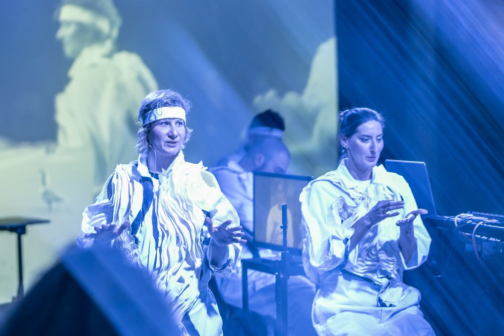 Pomiędzy dwoma sektorami krzeseł znajduje się technologiczna wyspa. Na stołach ustawiono monitory, konsole z licznymi pokrętłami i inne interfejsy połączone plątaniną kabli, a także - nierozpoznawalne dla mnie - urządzenia pomiarowe. Dookoła wyspy siedzą i kręcą się osoby w białych kombinezonach z oryginalnymi, wręcz fantazyjnymi, rozcięciami na plecach (kostiumy i scenografia: Grupa Mixer), sugerującymi pęknięcia umweltu. Ziajski wita przybyłych, zapraszając do "twórczego i aktywnego" udziału w badaniu, w którym uczestniczyć będzie osiem osób spośród publiczności. Wybranym z liczniejszej grupy ochotników zostają założone opaski rejestrujące dane biometryczne: HRV (zmienność rytmu zatokowego serca, która - co niestety nie zostaje wyjaśnione - jest wskaźnikiem aktywności autonomicznego układu nerwowego podczas dostosowywania się mózgu do zmian środowiska), saturację krwi i - określone bardzo ogólnie - współrzędne psychomotoryczne. Te informacje, zebrane również od czworga performerów, zanonimizowane, uśrednione oraz wzbogacone informacjami na temat natężenia światła i dźwięku w sali, posłużą do stworzenia modelu, obrazującego grupowe reakcje na bodźce. Tak rozumiem założenia twórców, choć nie zostały one przez nich jednoznacznie i czytelnie zaprezentowane. W efekcie przyrastający na ekranach z każdą sekundą, "subiektywny model" zbiorowego umweltu pozostaje interesującą, ale abstrakcyjną atrakcją wizualną. Do odczytania zakodowanych w niej sensów potrzebny byłby klucz, którego mi nie dostarczono. A może nie odnalazłem go sam, bo nie pozwoliły mi na to moje możliwości percepcyjne?