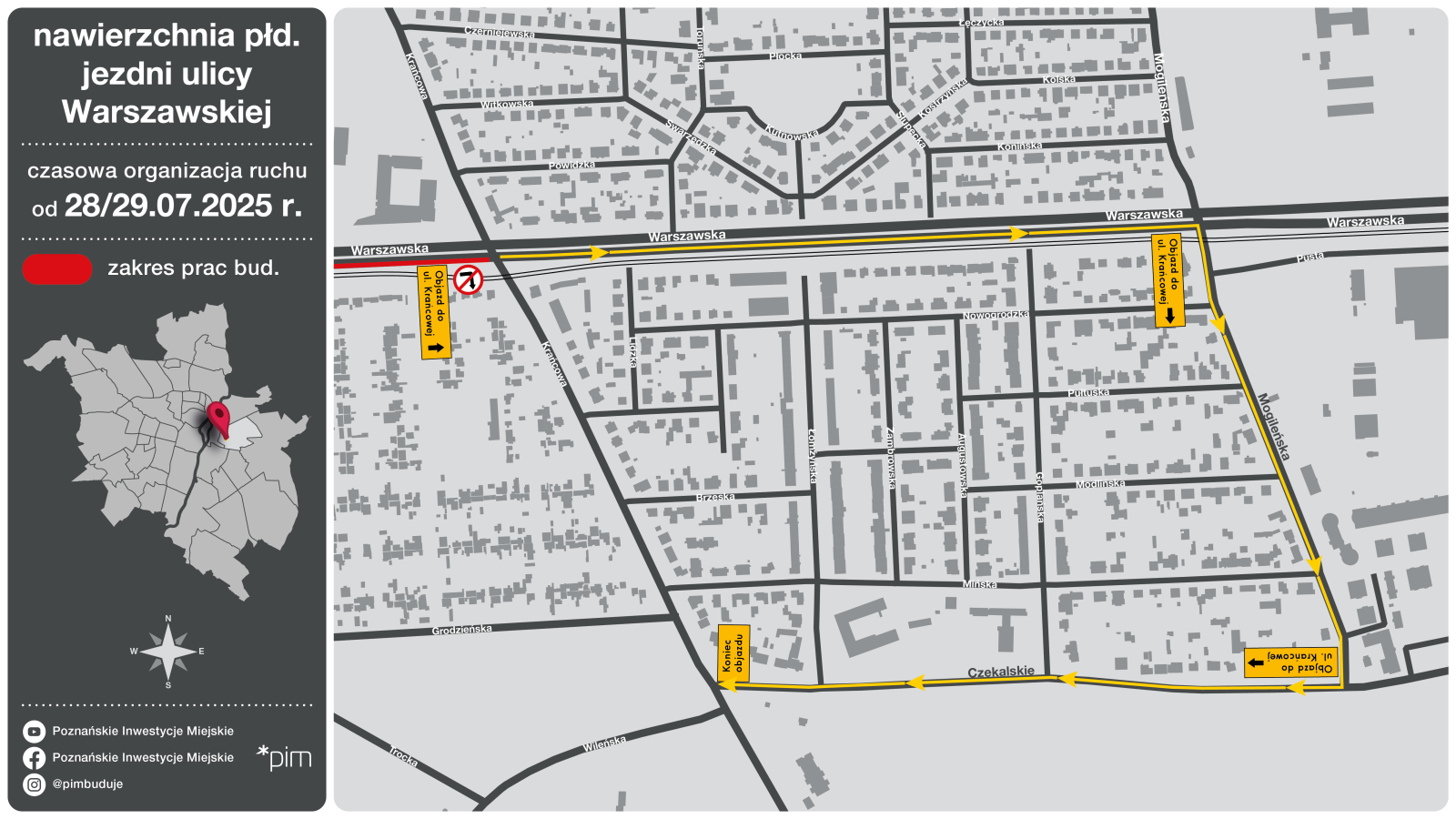 Realizowany obecnie remont obejmuje południową jezdnię ul. Warszawskiej, na odcinku od ul. św. Michała do ul. Krańcowej. Ze względu na trwające prace wyjazd z Poznania odbywa się tam jednym, zewnętrznym pasem ruchu. Wykonawca inwestycji przygotowuje się do robót polegających na układaniu masy bitumicznej na jezdni. Z tego względu w nocy z 28 na 29 lipca (z poniedziałku na wtorek) planowana jest zmiana w organizacji ruchu. S. Nie będzie można skręcić w prawo w ul. Krańcową, dlatego objazd wytyczony zostanie ulicami Mogileńską i Czekalskie.