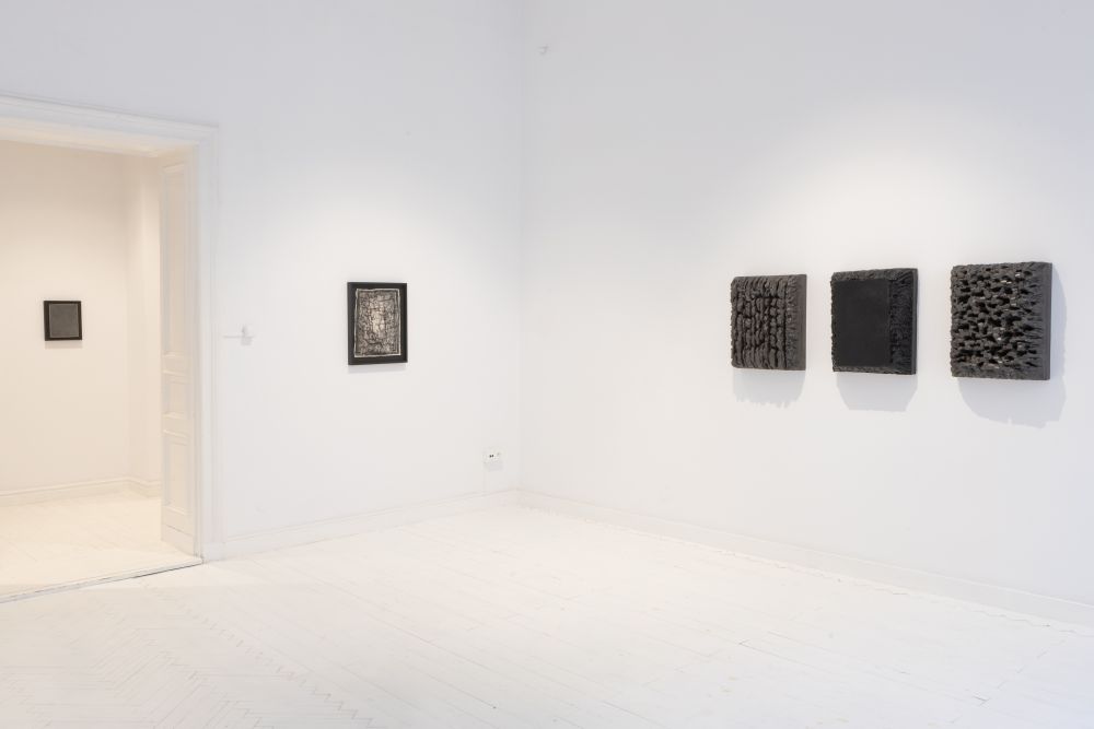 Dzieła określane jako malarskie sytuują się gdzieś pomiędzy malarstwem a rzeźbą. Prace prezentowane w tryptyku, w pierwszej, największej sali galerii to masywne, reliefowe obiekty, pozbawione ram. Fakturą przypominają grudy zaschniętego błota albo pęknięte skały wulkaniczne, powtarzają motyw kumulacji widoczny w pracach rysunkowych. W mniejszych, oprawionych w czarne ramy formatach, powraca motyw reliefu, który nie jest już tak masywny, jak w przypadku poprzednich prac. Zamiast faktury popękanej skorupy spotykamy się tu z miękkimi, wciąż błotnistymi, ale niekiedy niemal "pełzającymi" obiektami pochłaniającymi wspomniane ramy.