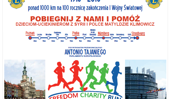 Biegacze, członkowie największej humanitarnej organizacji na świecie Lions Clubs, podczas każdego biegu zbierają środki na pomoc dla dzieci. Do tej pory zebrali blisko 100 tys. $ na pomoc dla dzieci na Ukrainie, na Łotwie, w Nepalu i w Niemczech. W tym roku, poza dziećmi z Syrii, biegacze zamierzają pomóc Matyldzie Klimowicz. Dziewczynka urodziła się z jedną krótszą nóżką. Konieczna jest kosztowna operacja w klinice, w USA. Pomóc można przez wpłatę na specjalne konto, wykup symbolicznych kilometrów, dołączenie do biegu w dowolnym miejscu na trasie lub zakup koszulki biegowej. Organizatorzy deklarują, że każda zebrana złotówka trafi do potrzebujących bowiem wszystkie koszty biegu pokrywają sami uczestnicy bądź pokryte zostaną dzięki życzliwości sponsorów.