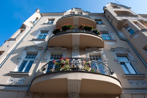 On our left we pass town houses at numbers 3-7 designed by P. Pitt, and opposite there is town house No. 67 whose spectacular facade can easily compete with them. This house was owned by Anton Künzel, a designer who placed the attributes of his profession on the cartouche at the facade - a plummet, a steel square and a compass.