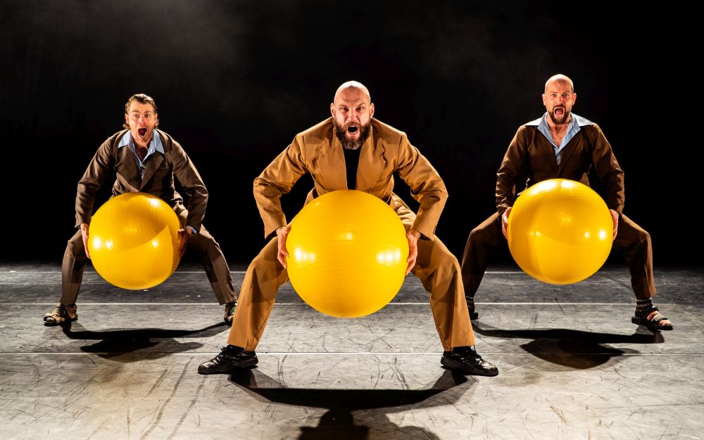 Trzech mężczyzn kuca z wielkimi, żółtymi piłkami. - grafika artykułu