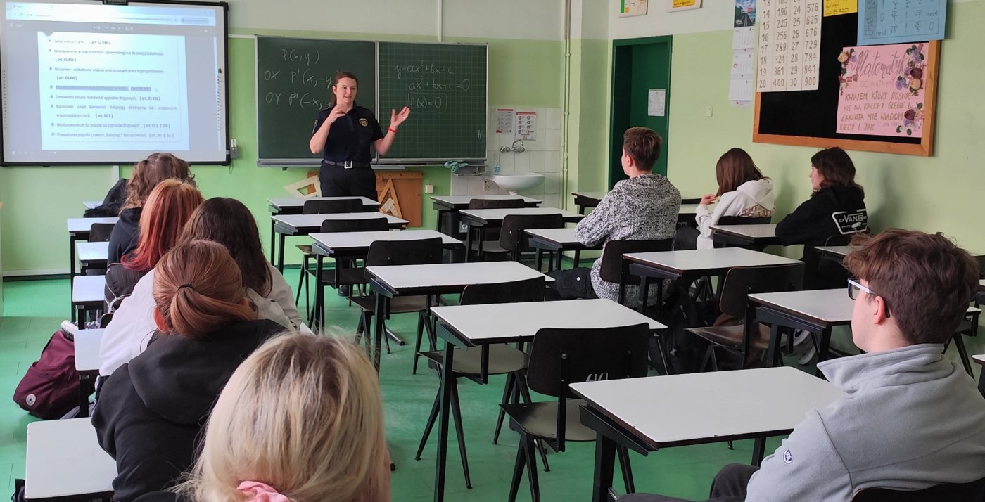 Spotkania edukacyjno-profilaktyczne w XVII LO 17 miały na celu uświadomienie młodzieży-uczniom klas drugich i trzecich zakresu odpowiedzialności za popełnienie czynów zabronionych. Przepisy prawa określają zasady odpowiedzialności - kończąc 13 lat, do ukończenia 17 roku życia, za popełnienie wykroczeń lub przestępstw, odpowiadają wobec prawa jako osoby małoletnie, natomiast w przypadku demoralizacji do ukończenia lat 18. Podczas spotkań strażniczki z Zespołu Profilaktyki wyjaśniono wątpliwości dotyczące uprawnień (do lat 18 - karta rowerowa lub prawo jazdy) do poruszania się rowerem, czy elektryczną hulajnogą po drogach, także przypomniano zagadnienia dotyczące bezpieczeństwa ruchu pieszych. Ponadto poruszono tematykę używek (papierosy, alkohol) - zakup i korzystanie z nich, to przejaw demoralizacji. Ważną kwestią w szkole może być prawna odpowiedzialność uczniów za negatywne zachowania wobec nauczyciela, który jest funkcjonariuszem publicznym.